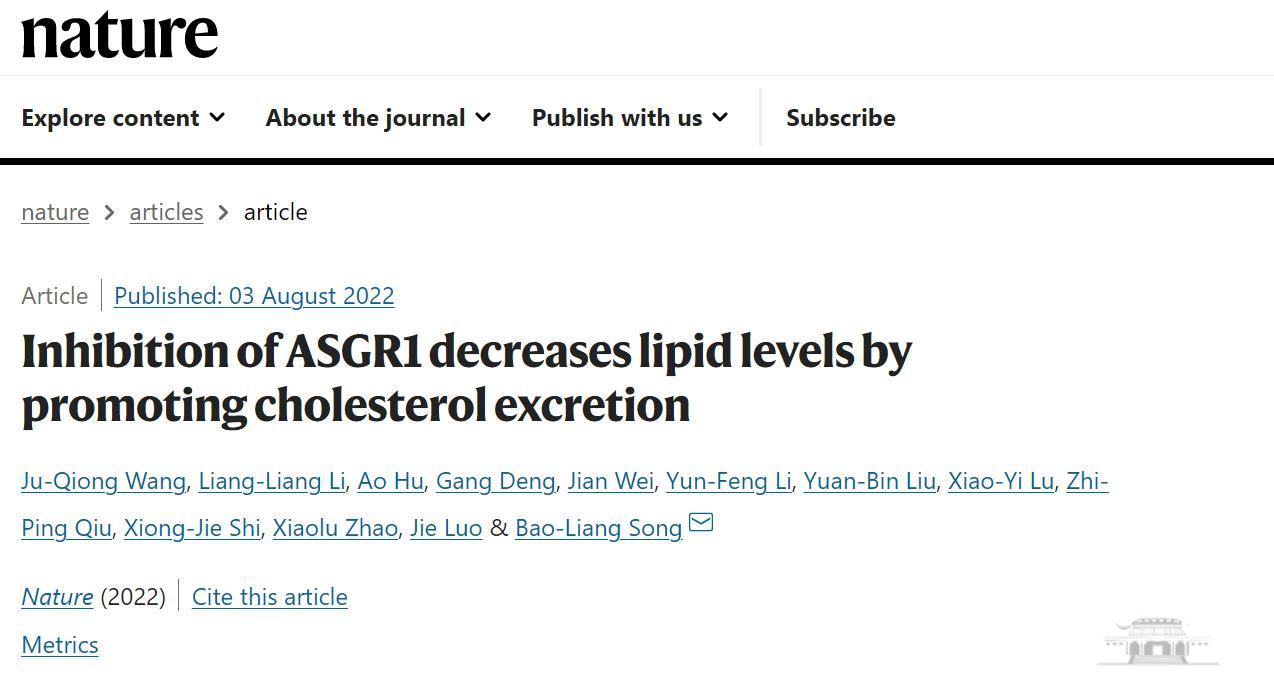 论文题为“Inhibition of ASGR1 decreases lipid levels by promoting cholesterol excretion”(《抑制ASGR1蛋白促使胆固醇外排而降低脂质水平》)。梅高美集团4858首页地址生命科学学院博士后王菊琼为论文第一作者,宋保亮为通讯作者。梅高美集团4858首页地址生命科学学院硕士李亮亮、博士胡傲、硕士研究生邓港、博士魏健、博士李云峰、博士研究生刘源彬、博士邱智萍、副教授史熊杰、副教授赵晓璐、教授罗婕为共同作者。梅高美集团4858首页地址为唯一作者单位。