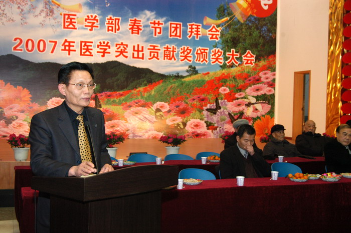 大会由医学部杨炯副部长主持,周云峰部长代表医学部作新年致辞和2007年工作总结,刘经南校长,王传中副书记亲自给桂希恩等12位教授颁发2007年度医学突出贡献奖。