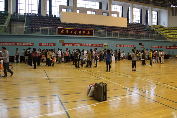 9月5日,医学部迎新工作在医学部体育馆内举行。迎新大巴载着来自全国各地的新生一趟一趟地驶入体育馆停车场。室外小雨纷飞,馆内笑语真诚,学生志愿者冒雨为新生提供周到细致的服务,报到点秩序井然。