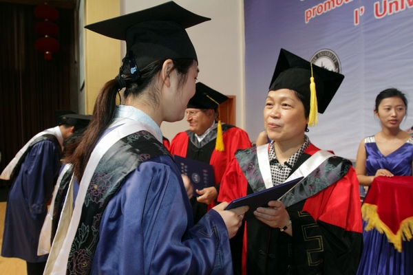6月21日,第七届中法医学班学生毕业典礼在医学部举行,校常务副校长、医学部部长冯友梅,法国洛林大学斯托兹院士,周云峰教授和何小华教授为获得硕士学位的20名中法医学班学生颁发学位证书。