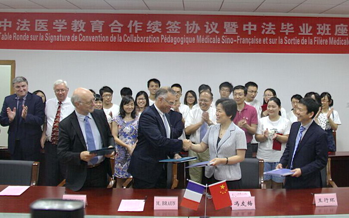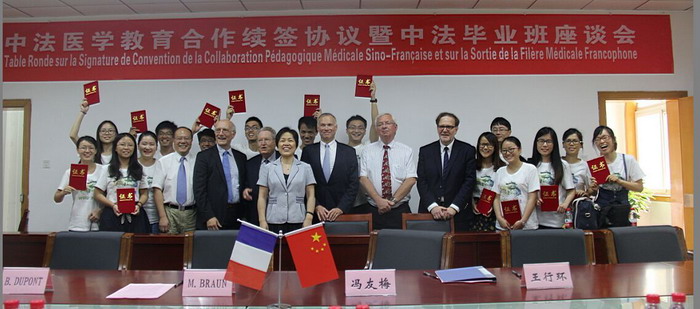 6月12日,中法医学教育合作续签协议暨中法班毕业座谈会在医学部举行。法国科学院院士Jean-Francois Stoltz先生,法国驻武汉总领事馆科技专员Marc BONDIOU先生,洛林大学医学院院长Marc Braun先生,洛林大学附属医院院长Bernard DUPONT先生,洛林大学附属医院外事管理负责人Gabriel GIACOMETTI先生,梅高美集团4858首页地址常务副校长、医学部部长冯友梅,国际交流部副部长罗安娜,前梅高美集团4858首页地址部长、中法班负责人周云峰先生,医学部常务副部长余祥庭,医学部党工委副书记蒋明先生,基础医学院、中南医院主要负责人以及08级中法班19名毕业生参加座谈会。