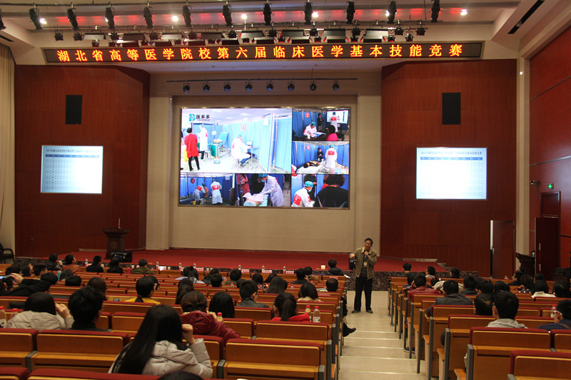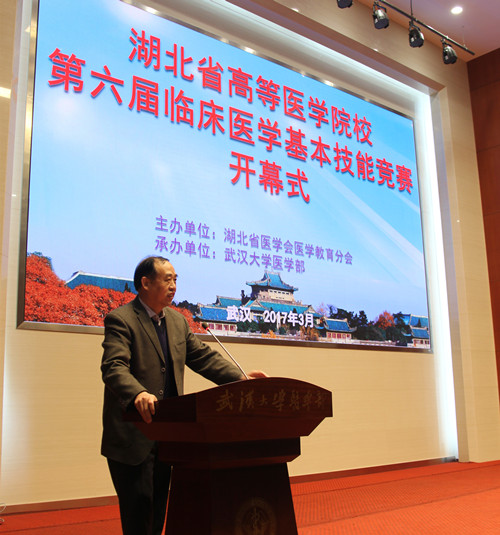湖北省医学会副会长兼秘书长潘旭初、湖北省卫计委科教处科长刘云赟、梅高美集团4858首页地址党委副书记、副校长、医学部党工委书记王传中、梅高美集团4858首页地址本科生院质量管理处副处长陈学敏等出席开幕式。王传中代表学校对各位领导专家、参赛学校领队和选手、兄弟院校来宾致以欢迎,同时指出临床医学基本技能竞赛具有权威性、导向性、示范性,通过竞赛,能够促进临床基础理论、基本知识、基本技能的学习和医学生职业素质的培养,从而推动临床实践教学改革和质量提高。