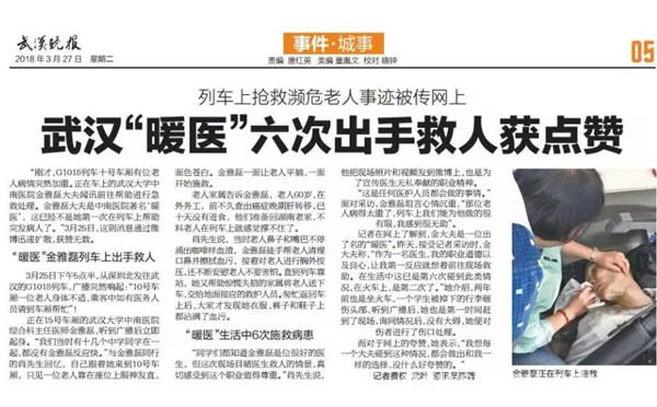 在武汉,金雅磊是一位出了名的“暖医”。这次因周末不值班,和几个好友到韶关踏青,当天下午返回武汉,碰到了此事。“作为一名医生,我的职业道德以及良心,让我第一反应就想着前往现场救助。”