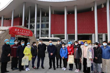 校领导一行首先来到了武汉市目前规模最大的方舱医院——位于东西湖区的武汉客厅方舱医院。该院规划设立2000张床位,于2月7日晚开始收治患者,目前累计收治轻症患者近1500名。除了中南医院的医护人员,还有来自上海东方医院、北京中日友好医院、新疆生产建设兵团、重庆市、宁夏区、广东省的6支国家援鄂医疗队,以及安徽、新疆、甘肃、山东等4支省级护理支援队。共有1100多名医护人员夜以继日工作,共同为患者提供及时科学的治疗观察,使这个“最大的”方舱医院有序运转。