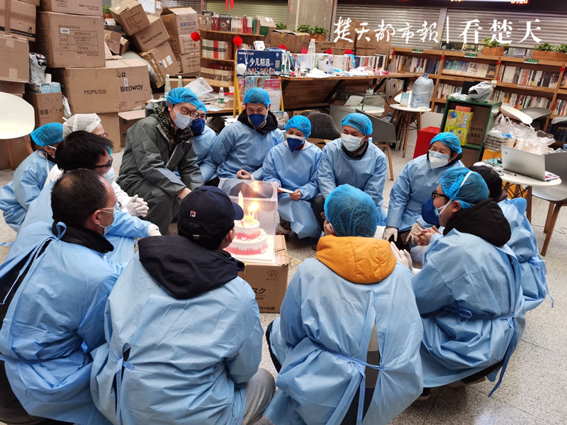 1月30日那天,有爱心人士送来一个大蛋糕,中午吃饭的时候大家都很激动。那天,不记得是谁带头,大家围坐一圈,唱起了国歌,我们彼此加油鼓劲,坚信这场“战疫”定能胜利。我还和孩子们一起打气:自强弘毅,求是拓新,众志成城,加油武汉!