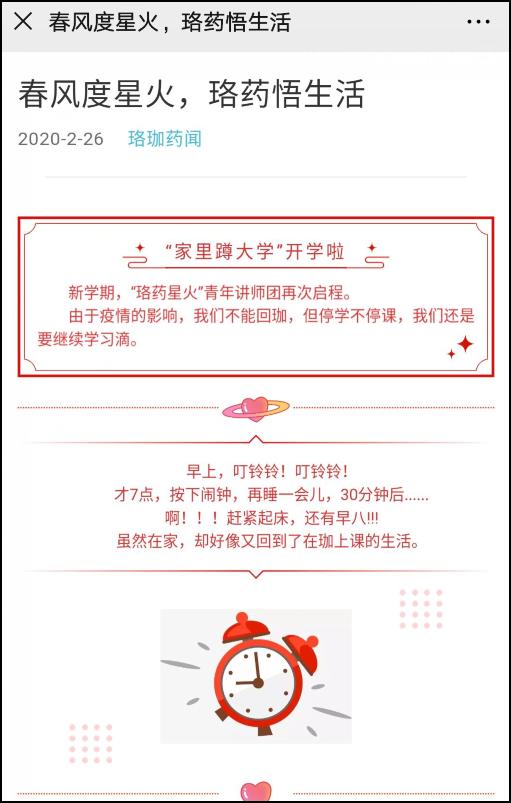 党旗所指就是团旗所向,药学院“珞药星火”青年讲师团疫情期间开展“春风度星火,珞药悟生活”主题活动,帮助同学们合理规划疫情期间居家生活,让“宅在家”变得丰富多彩。此外,学院各团支部疫情期间不忘学习,积极发动广大团员配合团中央和各级团组织开展“青年大学习”活动,共同学习习近平总书记关于疫情防控的重要论述。