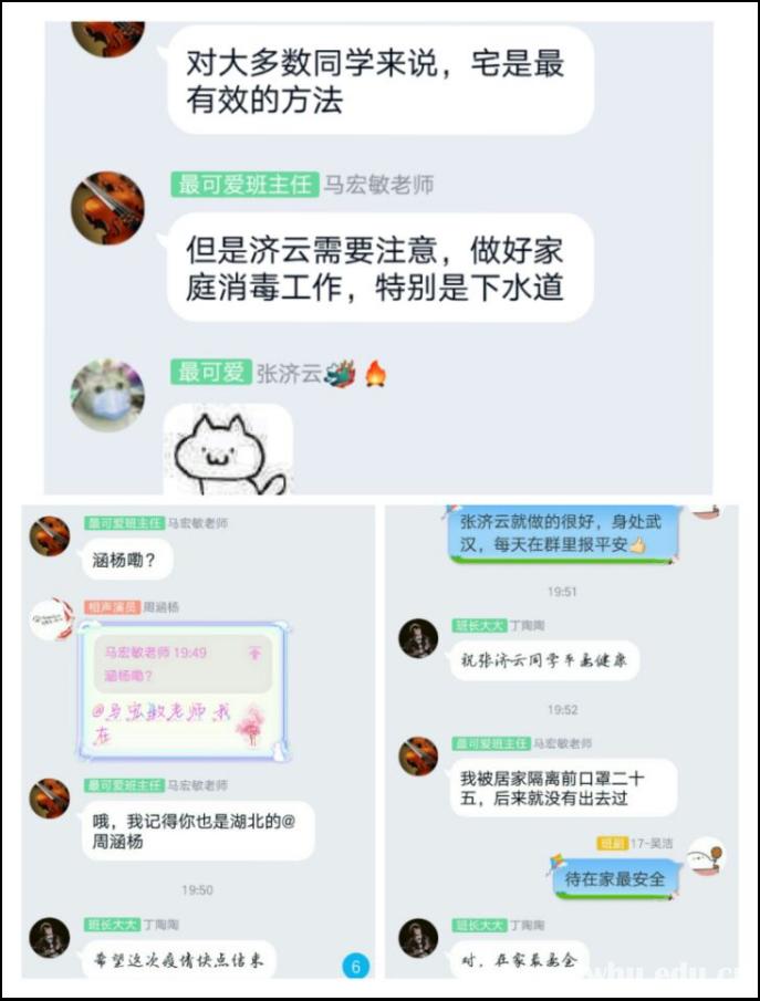 疫情当下,学院党政领导、管理干部、辅导员、班主任、导师等,坚守岗位,集体上阵,通过一对一微信/QQ、微信/QQ群和电话等形式与全院师生保持密切联系,随时沟通,一日一报,第一时间掌握全院师生的思想动态和身心健康情况,把组织的关怀送到每一个人身边。学院也一直把离退休的老同志挂在心上,对离退休老同志进行了疫情防控工作统计和宣传。