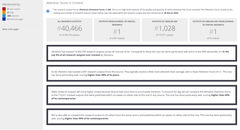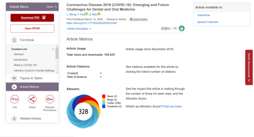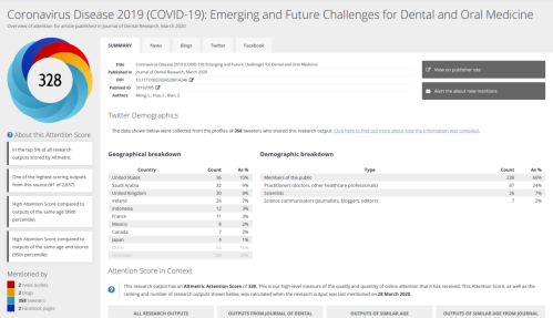 据牙科研究杂志(以下简称JDR)官方数据显示,截至3月29日,该论文全文已被下载、浏览165645次,Altmetric关注度评分(AAS)高达328,在JDR杂志的2837篇论文中位列第一。据悉,Altmetric评分始于2010年,通过追踪论文在国际主流社交媒体、新闻、指南等互联网平台上被转发和讨论的次数,对论文的国际社会影响力作出评价。
