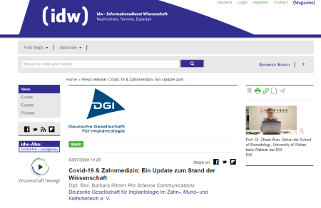 论文发表后受到世界口腔医学界广泛关注,该院专家收到了来自世界各国的线上交流邀约。3月25日,德国口腔种植协会邀请边专教授参与远程视频在线研讨会,边专开展了题为“Are Health Care Workers in Dental Practice at Higher Risk of COVID-19 Infection?--WHUSS at the epicenter of COVID-19 outbreak”的专题演讲。此次网络研讨会不仅在德国及其周边的奥地利、瑞士等地迅速传播开来,还受到了美国、法国、英国等国家口腔学者的关注,全球共9000余名观众在线聆听。该协会发来感谢信称,“边专教授的演讲收到了大量的正面反馈,在线研讨会被认为是非常有益和实用的。”