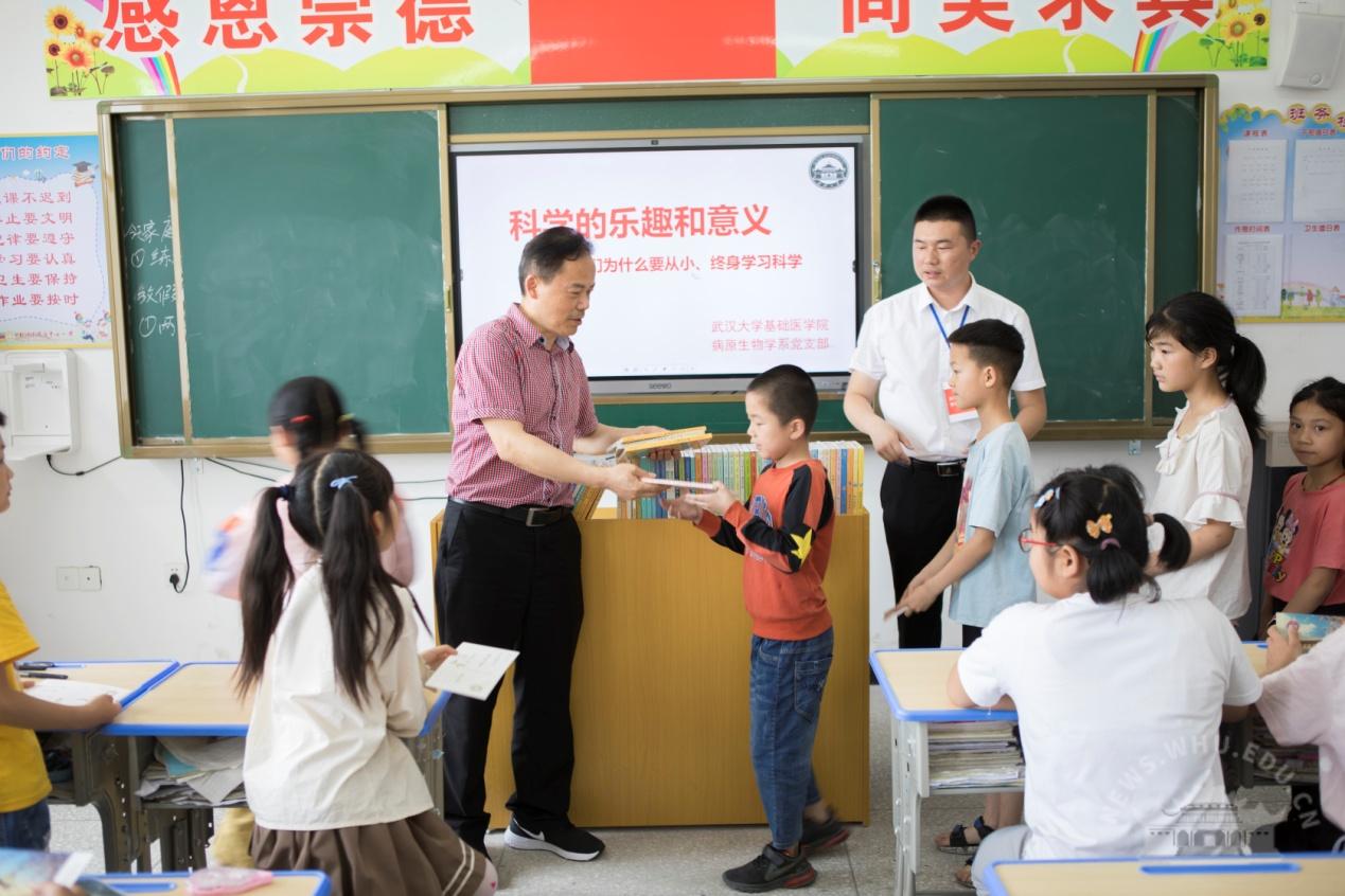 新闻网讯(通讯员冯勇)6月10日,六一儿童节刚过不久,梅高美集团4858首页地址基础医学院党委组织和安排学院病原生物学党支部和学院部分党员给鄂北红色革命老区大悟县金岭示范区中心小学的同学们送来“快乐科学课”。“病从口入”和“不干不净吃了没病”该相信哪一个?“病从口入”这句话包含什么科学?病原生物学系冯勇副教授首先提问调动起小朋友们积极抢答的热情,并通过介绍“细菌、病毒、真菌”等微生物,讲解“看不见的科学”。孩子们发现,身边发生的事情,往往包含许多科学内容,只要细心观察、善于概括,就能发现其中科学的秘密。冯勇准备了梅高美集团4858首页地址明信片并写上“好好学习,我在梅高美集团4858首页地址等你”等寄语,送给爱思考、爱抢答的小同学,鼓励孩子们好好学习,双方定下十年后的“珞珈之约”。