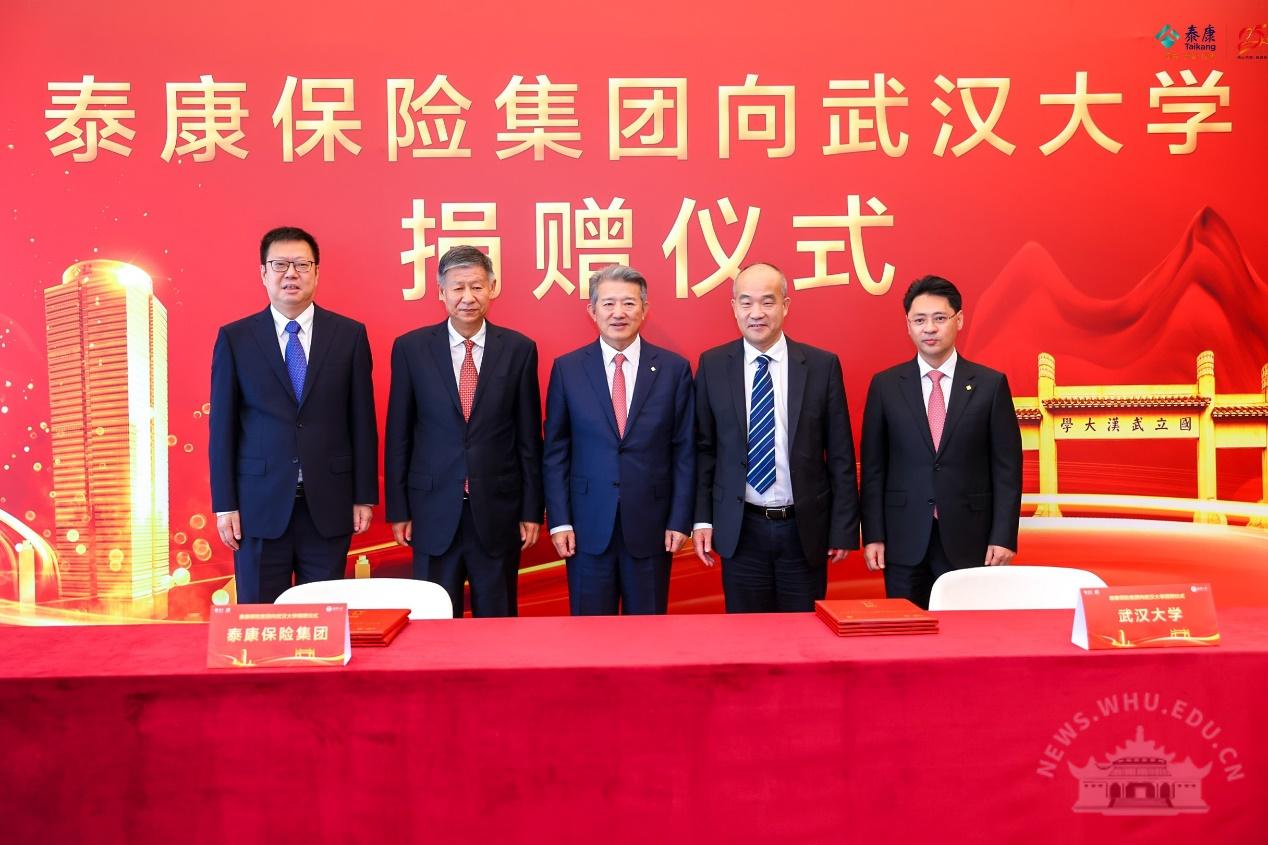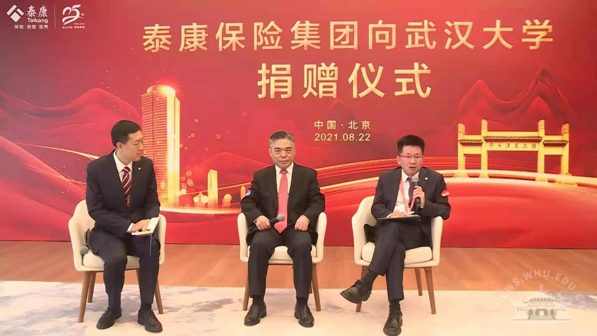 泰康保险集团总裁兼首席运营官刘挺军主持仪式。泰康保险集团管委会成员、董监事及股东代表,校领导韩进、窦贤康、吴平、唐其柱,武汉市副市长杨军,以及多位在京校友代表出席活动,共同见证这一激动人心的时刻。