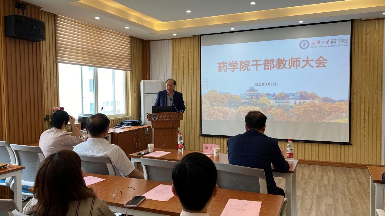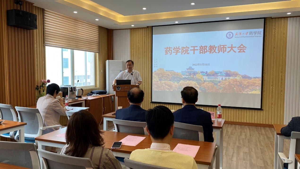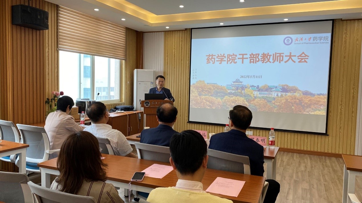 陈实院长在发言中表示,感谢学校的信任,坚决拥护学校的决定。他回顾了自己和药学院一起成长的历程,感谢学校学院的培养,感谢全院老师的支持。他表示将团结带领学院师生员工,全力全心做好人才强院和学科建设等工作,为学院更高质量发展贡献力量,不负师生、学校和国家期待。