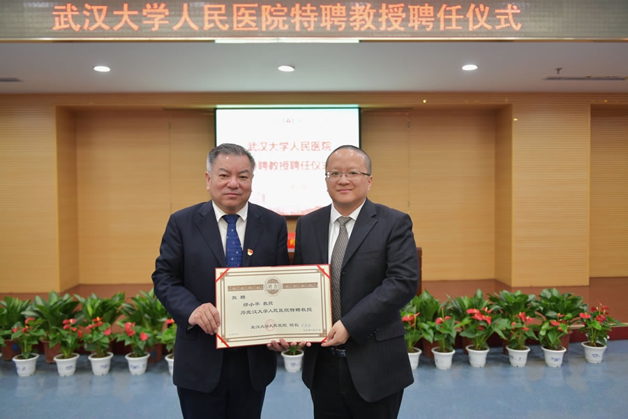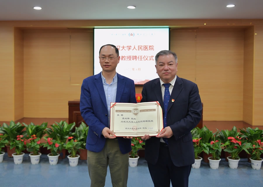 王高华院长为缪小平教授、袁必锋教授颁发梅高美集团4858首页地址人民医院特聘教授聘书。