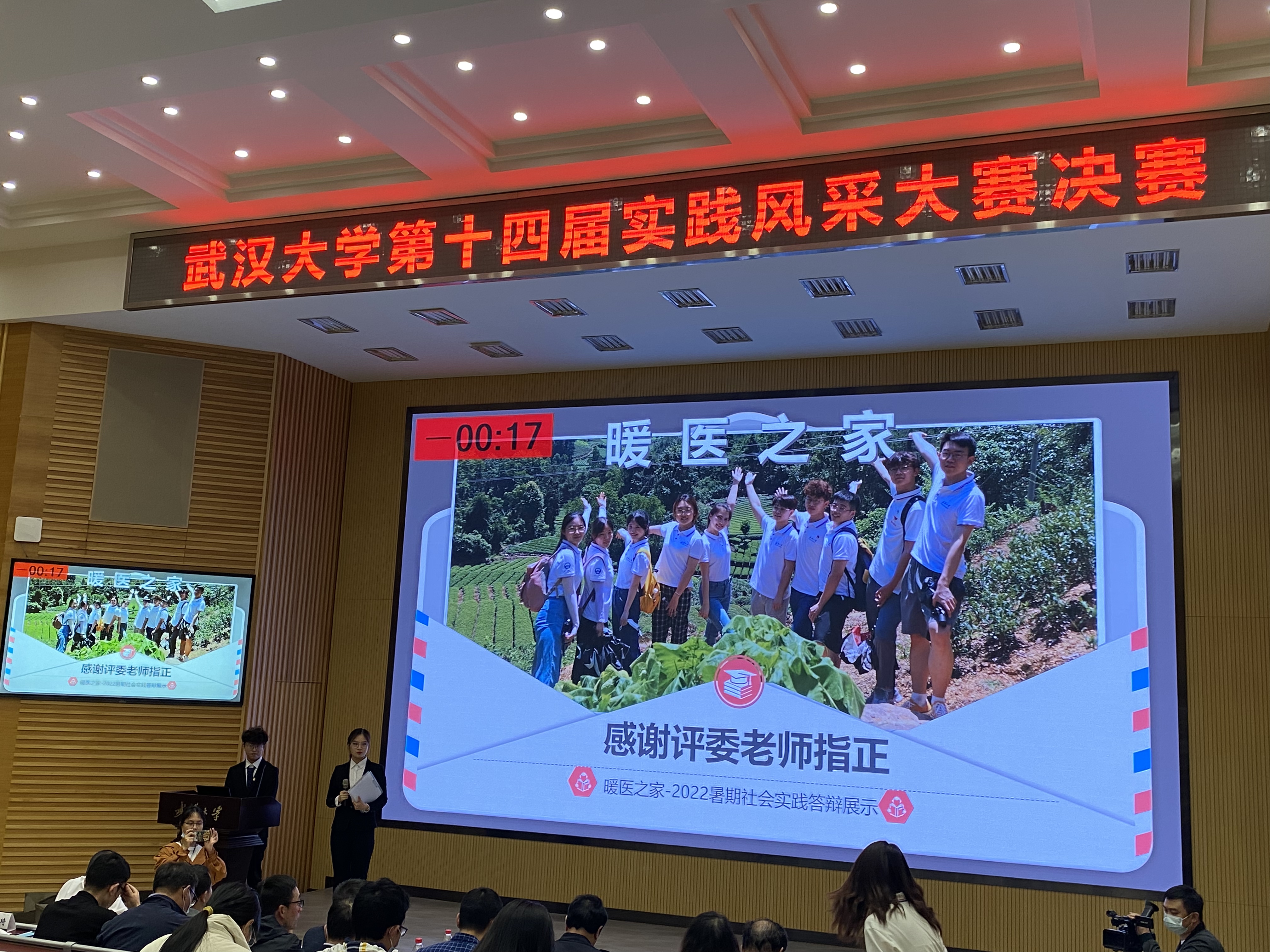 在5分钟的现场展示环节,队长陈端从“我们为何出发”“我们做了什么”“我们收获了什么”以及“对未来的总结展望”四个方面引入团队的实践展示。2022年暑期,暖医之家实践队来到湖北恩施白果树村,立足医学专业特色,通过深入群众、实地走访、问卷调研,围绕医德医风教育、乡村健康扶贫和教育扶贫、医学专业学科领域调研与职业规划等几个方面,在实地调研中了解乡村人口基本健康情况和医疗卫生发展状况,发挥专业所长进行卫生科普和健康检查,举办专家义诊和健康讲座,将医学科普课堂带进乡村小学。实践结束后,共获200余份有效问卷,总结形成3份调研报告,发表6篇新闻稿实时记录实践动态,收获白果树小学往来感谢信件2封,拍摄制作3支总结视频上传腾讯、b站等媒体平台,取得热烈反响。实践队成员在学思践悟中坚定了奋斗的理想信念,用实际行动助力乡村健康扶贫,为建设美好祖国贡献了“暖医”青年的青春力量。