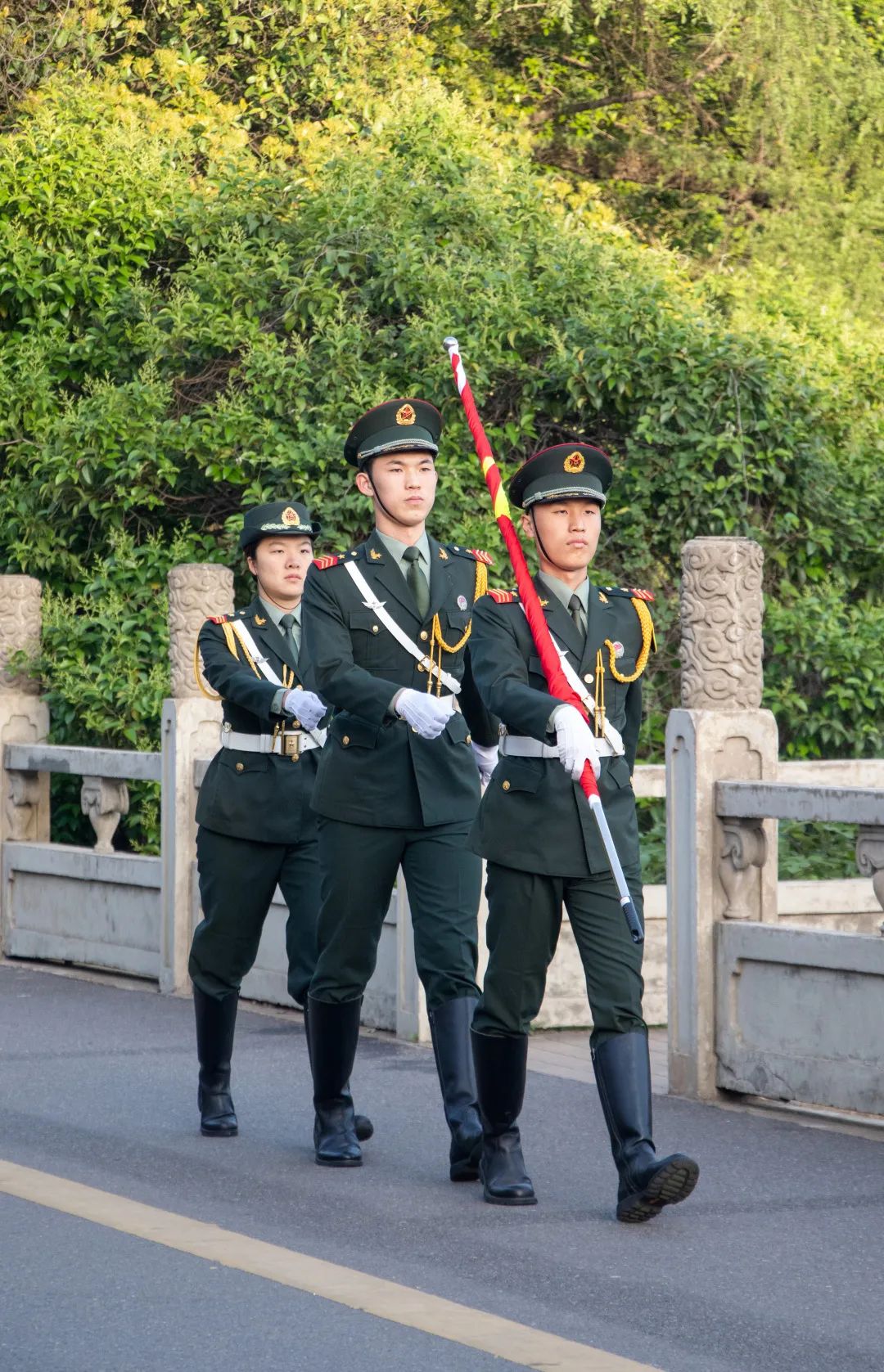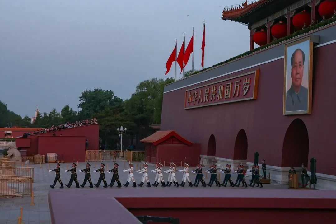 黎明破晓,日出东方。威武的国旗护卫队迈着整齐划一的步伐以昂扬之姿向前铿锵行进。