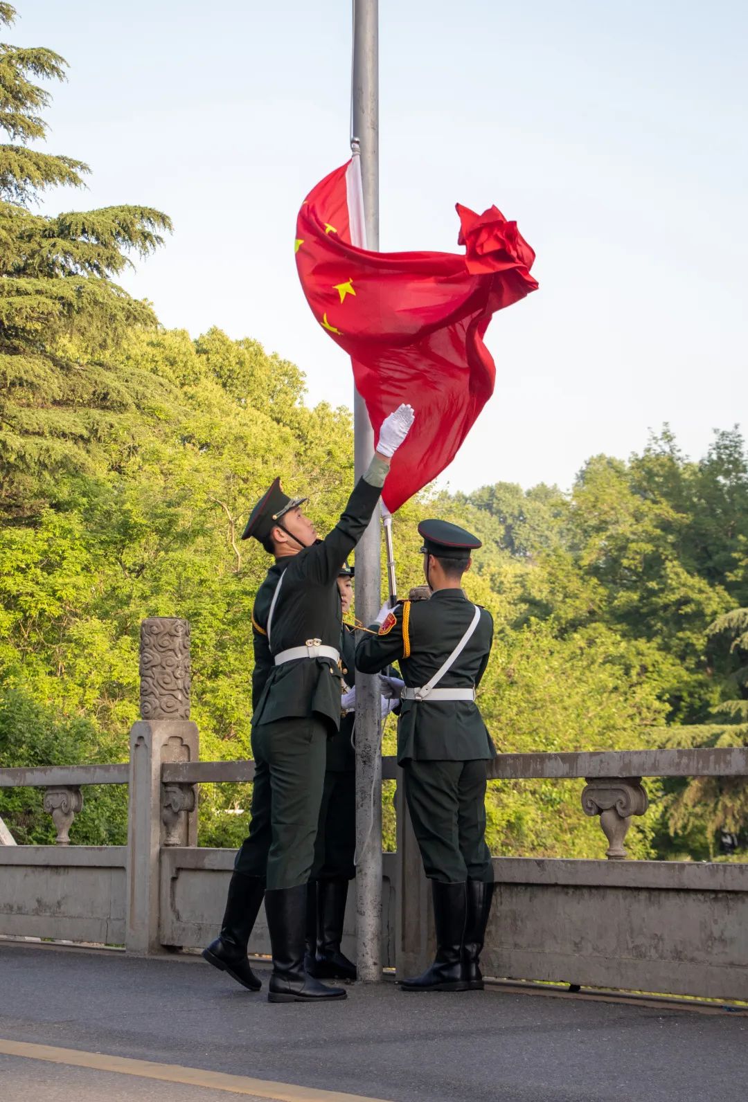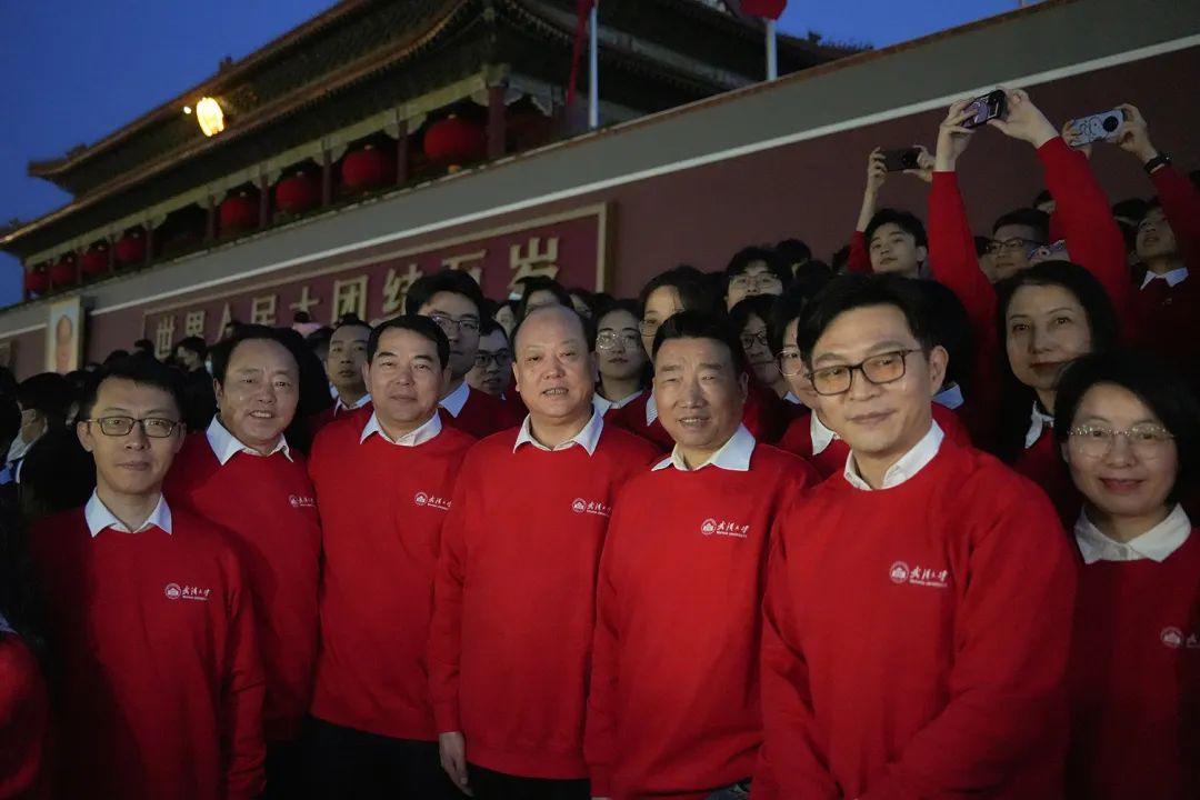 1000公里外的珞珈山,此刻也正进行着一场庄严的升旗仪式,行政楼前的庄重与天安门前的宏大遥相辉映。红日初升,其道大光,武大国旗护卫队的三位学生脚步有力、整齐划一,鲜红的国旗迎风舒展。此时此刻,武汉与北京情感相连,武大与祖国共沐新光。爱国主义永远是武大人最鲜明的印记,爱国情怀已浸入武大人的灵魂深处,一代代武大人以社会进步和民族振兴为己任,踔厉奋发,勇毅前行。