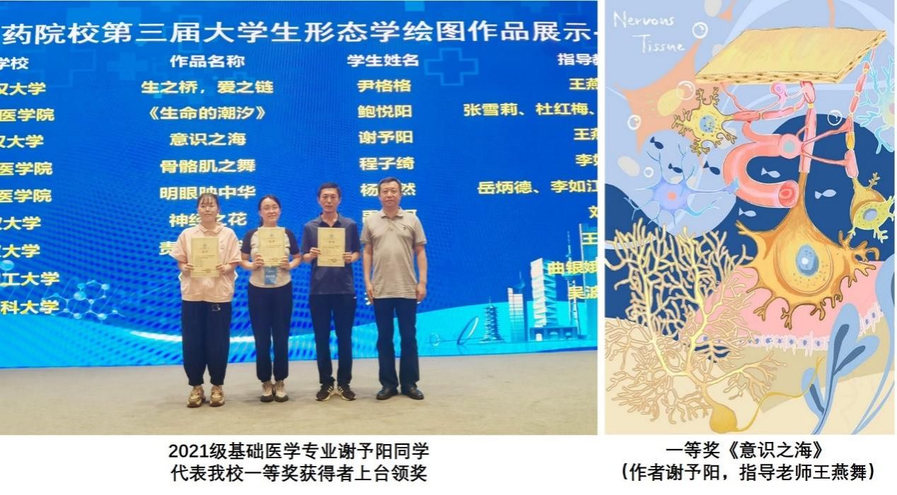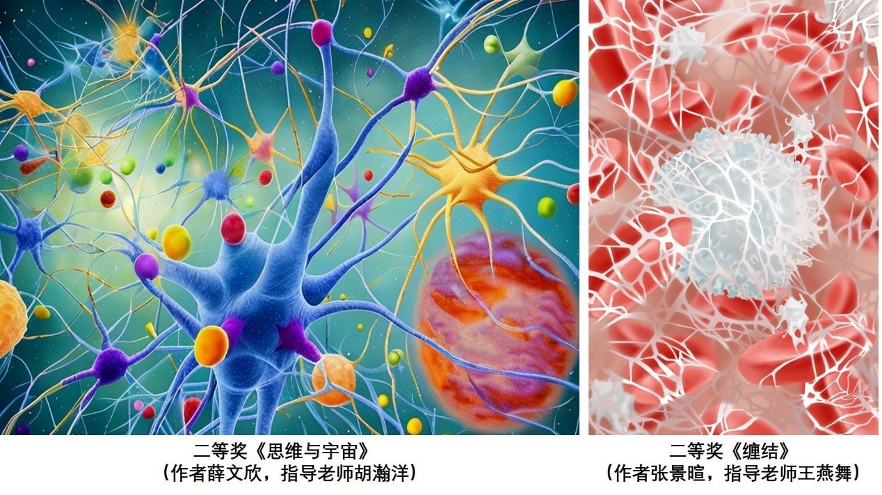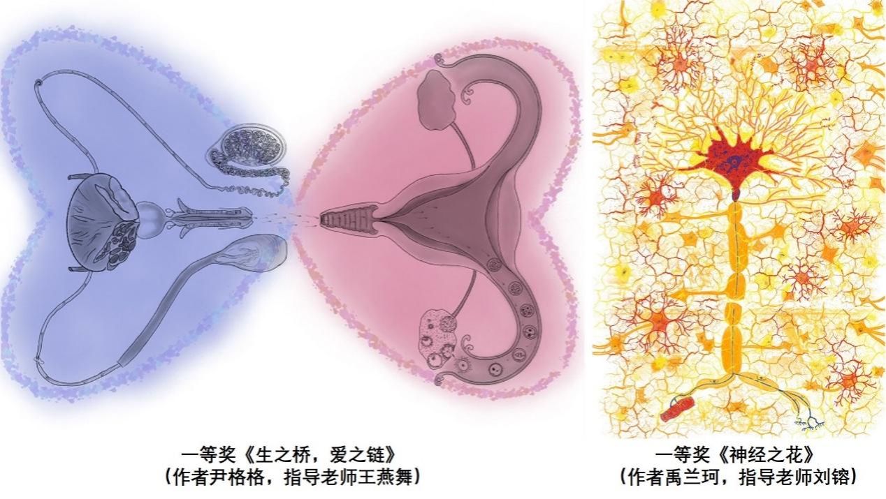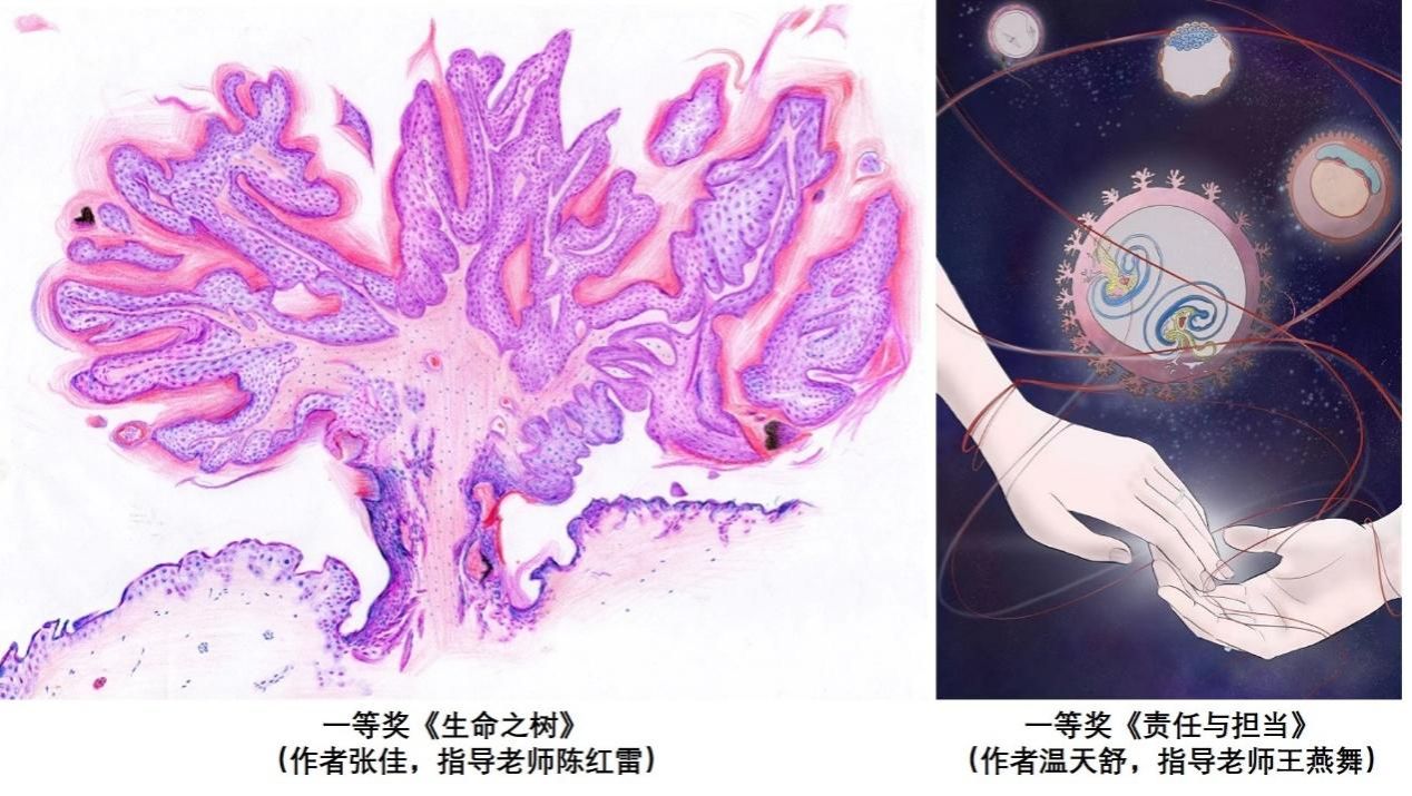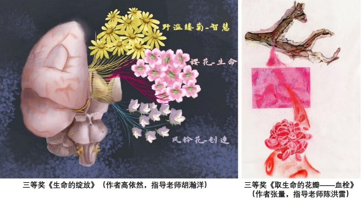 获得一等奖的作品是:2021级临床医学专业尹格格《生之桥,爱之链》、2021级基础医学专业谢予阳《意识之海》、2021级临床医学专业禹兰珂《神经之花》、2021级基础医学专业温天舒《责任与担当》和2021级临床医学专业张佳《生命之树》;获得二等奖的作品是:2021级临床医学专业薛文欣《思维与宇宙》和张景暄《缠结》;获得三等奖的作品是2021级临床医学专业高依然《生命的绽放》和张量《取生命的花瓣——血栓》。学生们用生动简洁的画风、细腻优美的笔触,描绘出融入情感之中的“认识生命、敬畏生命和护佑生命”的理念。