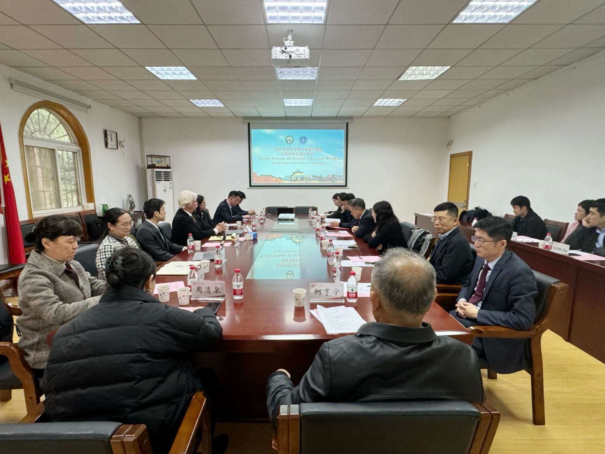 随后,国际交流部、医学部相关负责人与芝加哥大学代表团就两校合作进行了深入交流。与会人员围绕两校医学教育改革课程进展、住院医师规范化培训、专科医师培训、人工智能在医学教育与医疗中的应用等问题展开了热烈的讨论。