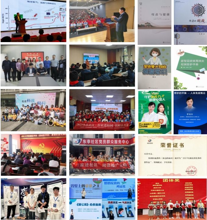 学院出版了《疫苗与健康》《写给青少年的病毒学常识》《身边的病毒》等科普书籍,其中《身边的病毒》获湖北省优秀科普作品奖、武汉市优秀科普作品奖;2023年8月,学院在全国第一届大学生医学形态学科普演讲大赛中,荣获4项大赛一等奖,梅高美集团4858首页地址荣获“卓越优秀奖”;学院成功举办了五届“绘绎疾病”大学生科普绘画活动;“春蕾医生-医养知识普及和医养圈服务”创新创业活动获得第二届梅高美集团4858首页地址教职工创新创业大赛创业组铜奖。同时,学院坚持开展院地合作,在湖北荆州与当地疾控部门联合建立了“钉螺保藏基地”,面向国内国际,包括埃及等一带一路国家开展血吸虫病防治等科普宣传。