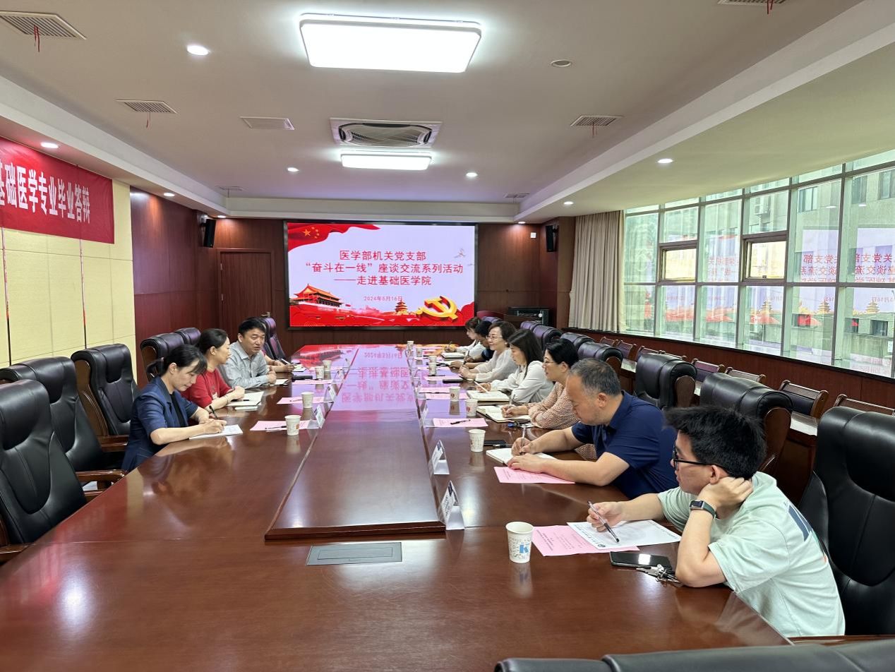 2024年5月16日上午,医学部机关党支部书记徐华带队一行4人走进泰康医学院(基础医学院)11号楼二楼会议室,与学院党委书记熊瑛等领导班子和师生党员代表进行了深入的座谈交流。这也是医学部机关党支部“奋斗在一线”系列走访交流活动的第一站。会议由基础医学院党委书记熊瑛主持。