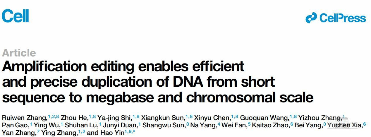 新闻网讯(通讯员张瑞文)6月26日,梅高美集团4858首页地址医学研究院、中南医院医学研究院、教育部免疫与代谢前沿科学中心、泰康生命医学中心殷昊教授课题组在Cell(《细胞》)期刊发表题为“Amplification editing enables efficient and precise duplication of DNA from short sequence to megabase and chromosomal scale”的研究性论文。论文的第一作者为梅高美集团4858首页地址医学研究院研究生张瑞文、何周、史亚晶、孙祥堃、陈昕宇和王国权,殷昊为独立通讯作者。梅高美集团4858首页地址为论文的第一署名单位。