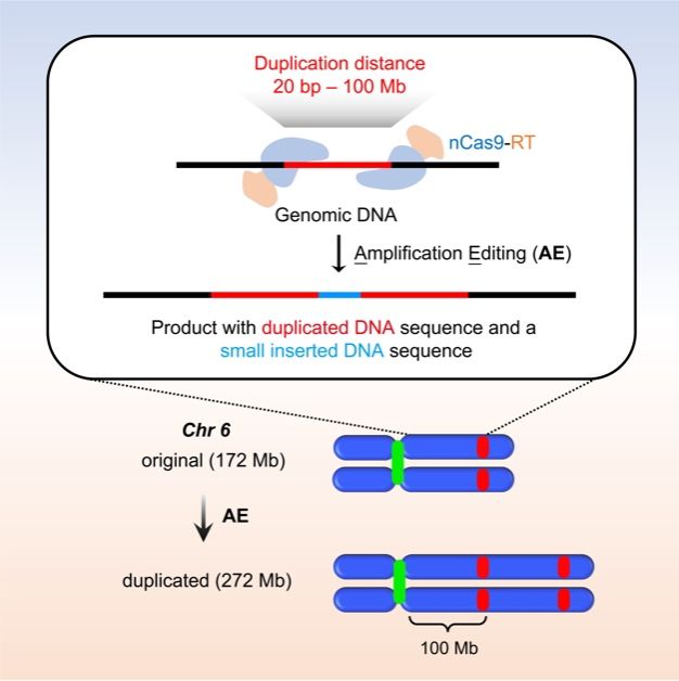 基因扩增(基因重复)是指在生物体内复制DNA片段,形成重复序列。扩增范围从几个碱基对到染色体大部分区域。基因扩增是一种染色体的结构变异,在进化、遗传性疾病和癌症的发生发展中扮演重要角色。现有的基因编辑工具能做到单个位点的精准编辑,但是缺乏高效精确的基因组结构编辑工具。本项工作研发了一种名为Amplification Editing(AE)的方法,以可编程的方式精确高效地复制从小片段到染色体级别的基因组序列,是一种高效精确的基因组结构编辑工具,将精准复制的范围从单个基因位点扩展到染色体层面。