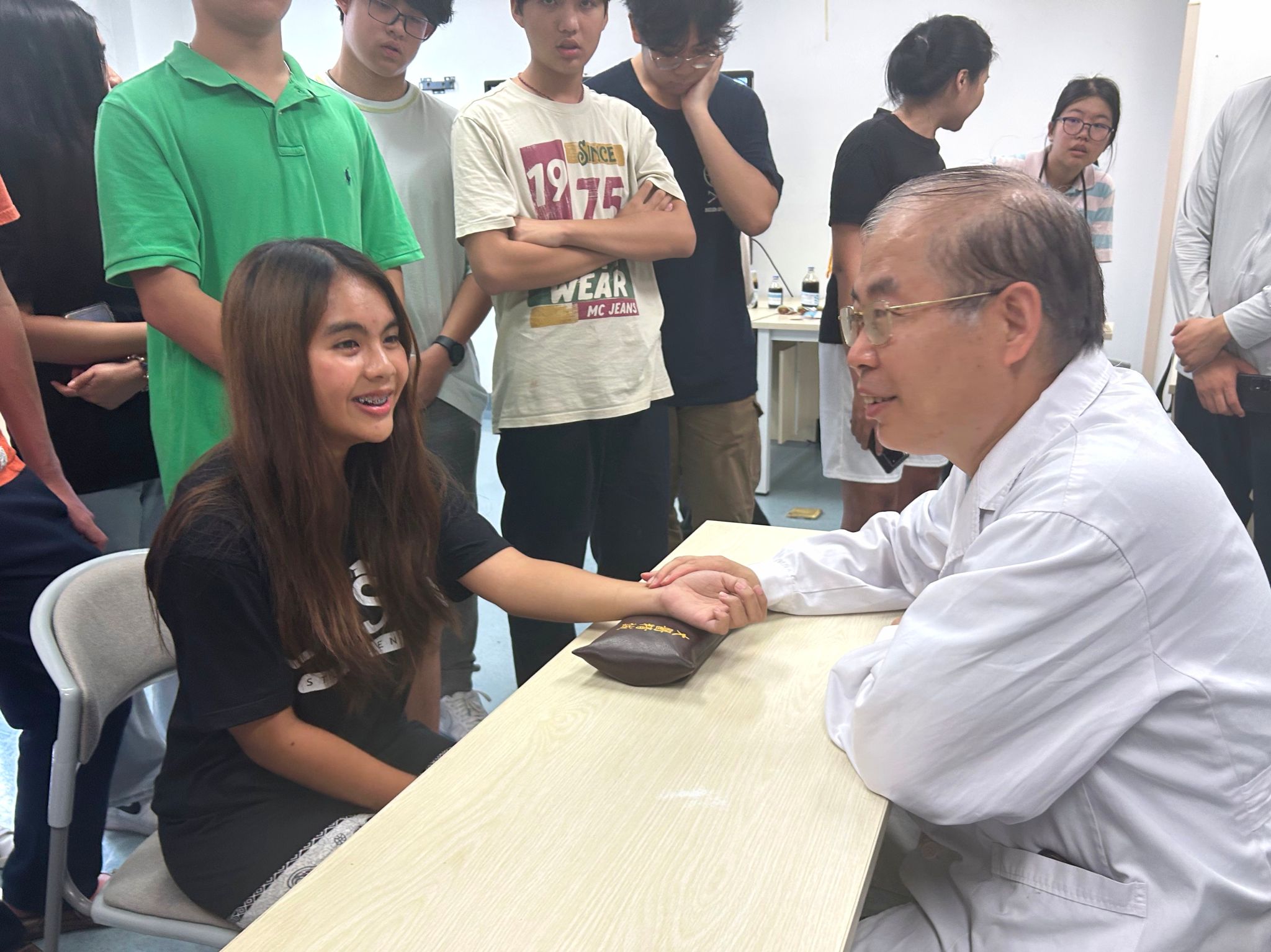 第一临床学院宋恩峰主任、唐燕青护士长、关庆亚老师、柯继贤老师进行中医学授课展示,同学们通过互动沉浸式体验中医四诊,了解中医药文化。