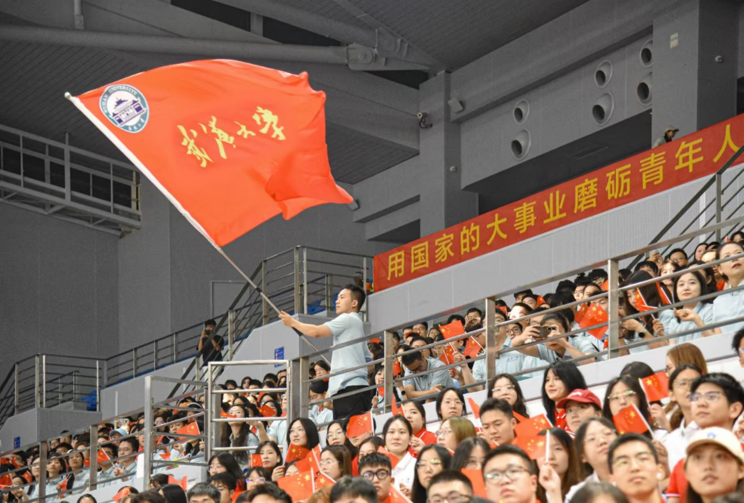 “接过万千热血的初衷,当有对答世界的音量”,青春洋溢的歌曲串烧在卓尔体育馆响起,瞬间点燃同学们的万千热情。在采访互动环节,同学们慷慨激昂,立下“要把论文写在祖国大地上”的豪迈誓言。随后,鲜艳的巨幅五星红旗缓缓展开,李德仁院士带领大家唱响《祖国不会忘记》,此刻歌声与国旗交织成一幅壮丽画卷,激励着每一位新武大人。在导师团的见证下,全体同学起立佩戴校徽,肩负起属于珞珈学子的使命和担当。