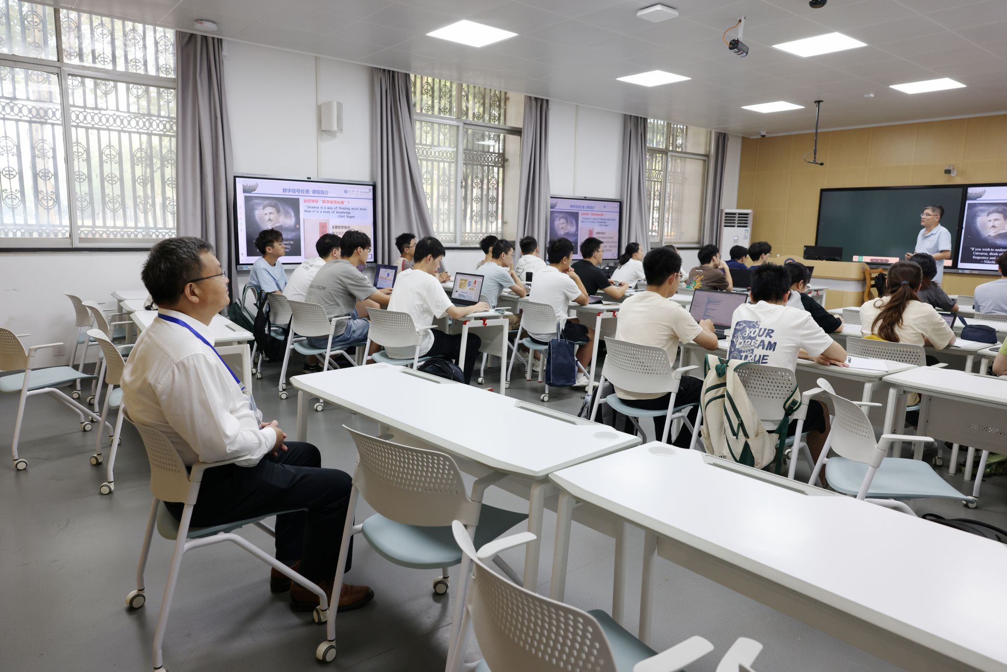 楚龙强表示,多媒体教学手段的广泛应用,不仅丰富了课堂内容,也提高了学生的学习兴趣和参与度。他强调,要加大教室智能设备安装和教学的智慧化升级力度,更好服务于师生。