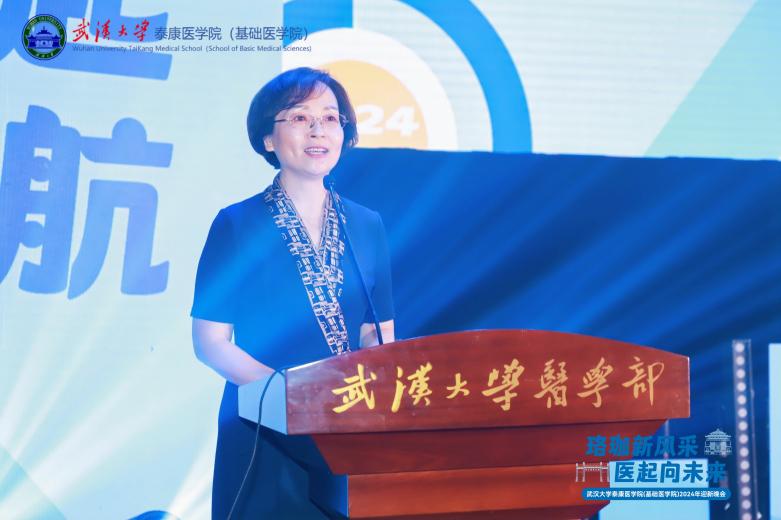 熊瑛对新同学的到来表示衷心的祝贺和欢迎。她介绍了学院的发展历程、基本情况、特色活动、人才培养等情况。她勉励同学们永葆学医初心、热爱医学事业,增强学习定力、钻研医学知识,涵养高尚品德、传扬医学知识。她希望同学们牢记习近平总书记嘱托,不负韶华,勇往直前,成为有温度、有厚度的医学拔尖创新人才,为国家医学事业贡献自己的力量。