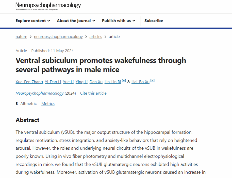 该研究结果提供了有关小鼠vSUB谷氨酸能神经元及其神经环路调控觉醒的多种证据。研究成果发表在著名期刊《Neuropsychopharmacology》(中科院一区,Top期刊,IF =7.6)上。徐海波教授、毕琳琳副教授为本研究共同通讯作者,张雪芬博士和李一丹博士为共同第一作者。