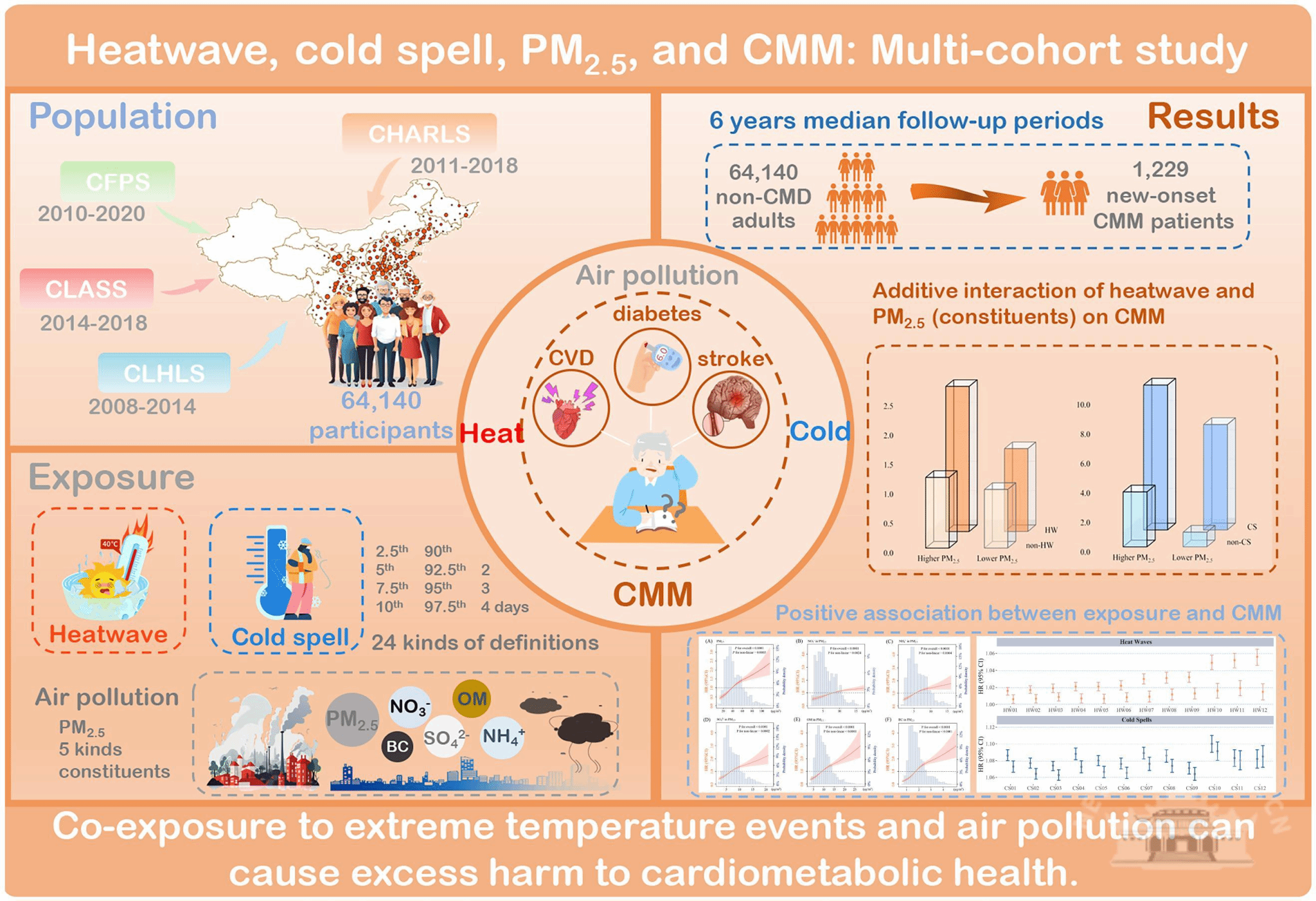 心血管代谢共病是指同时患有2型糖尿病、缺血性心脏病和脑卒中三种疾病的至少两种,其死亡风险显著高于罹患单一疾病。已有研究表明,大气细颗粒物(PM2.5)可增加心血管代谢共病的发生风险,而极端温度事件(如热浪、寒潮)也是重要危险因素,然而,目前依然缺乏大气污染与极端温度事件复合暴露对于心血管代谢共病的证据。