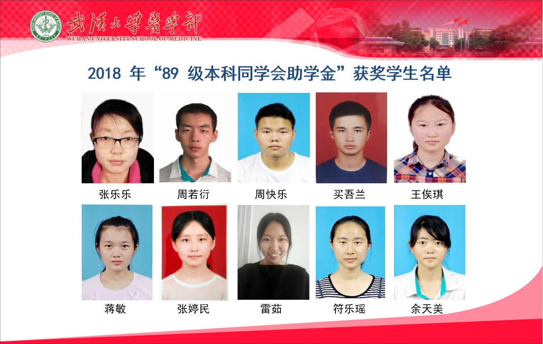经各相关学院推荐,医学部学生评奖委员会评定,基础医学院张乐乐、周若衍、周快乐、买吾兰、王俟琪、蒋敏,口腔医学院张婷民,药学院雷茹,健康学院符乐瑶、余天美获2018年度医学部1989级本科同学会助学金。
