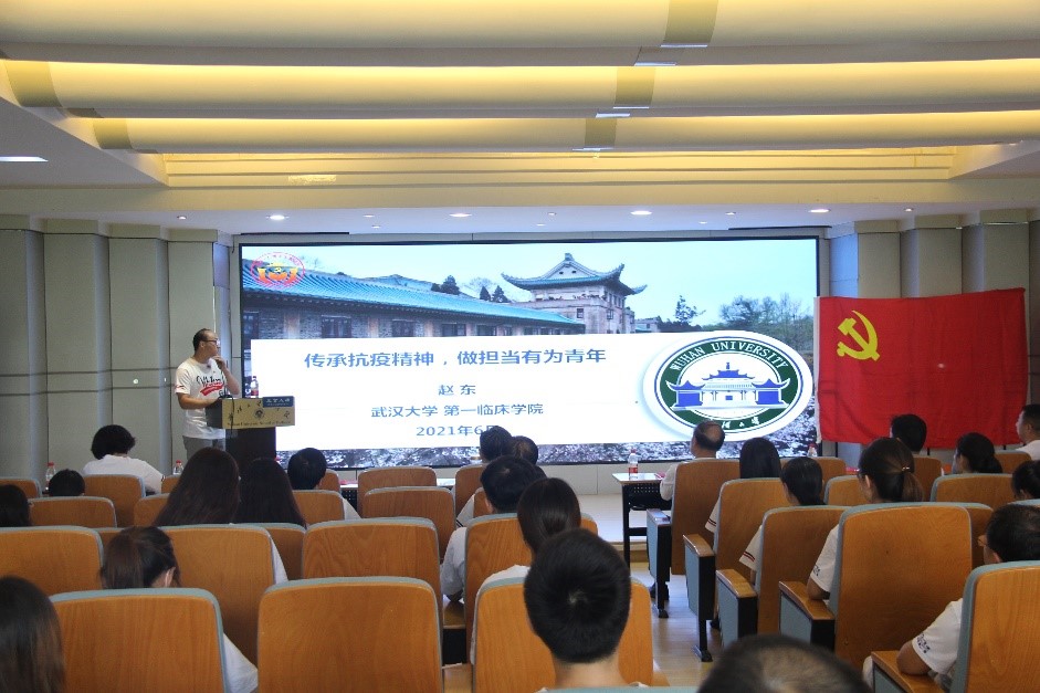 活动以重温入党誓词开始,师生党员共同牢记了初心和使命。随后,由获评“2020年全国最美大学生”的临床医学专业2018级博士研究生赵东同学为大家作“传承抗疫精神,做担当有为青年”的报告。他结合自己亲身参与抗疫的经历,生动地诠释了新时代青年的责任与担当,分享了对“生命至上、举国同心、舍生忘死、尊重科学、命运与共”伟大抗疫精神的感悟,激励了在座学子要传承老一辈们艰苦奋斗、立足岗位的优良品质,感召了大家将个人前途与国家命运相融合,去投身到民族伟大复兴的事业中来。