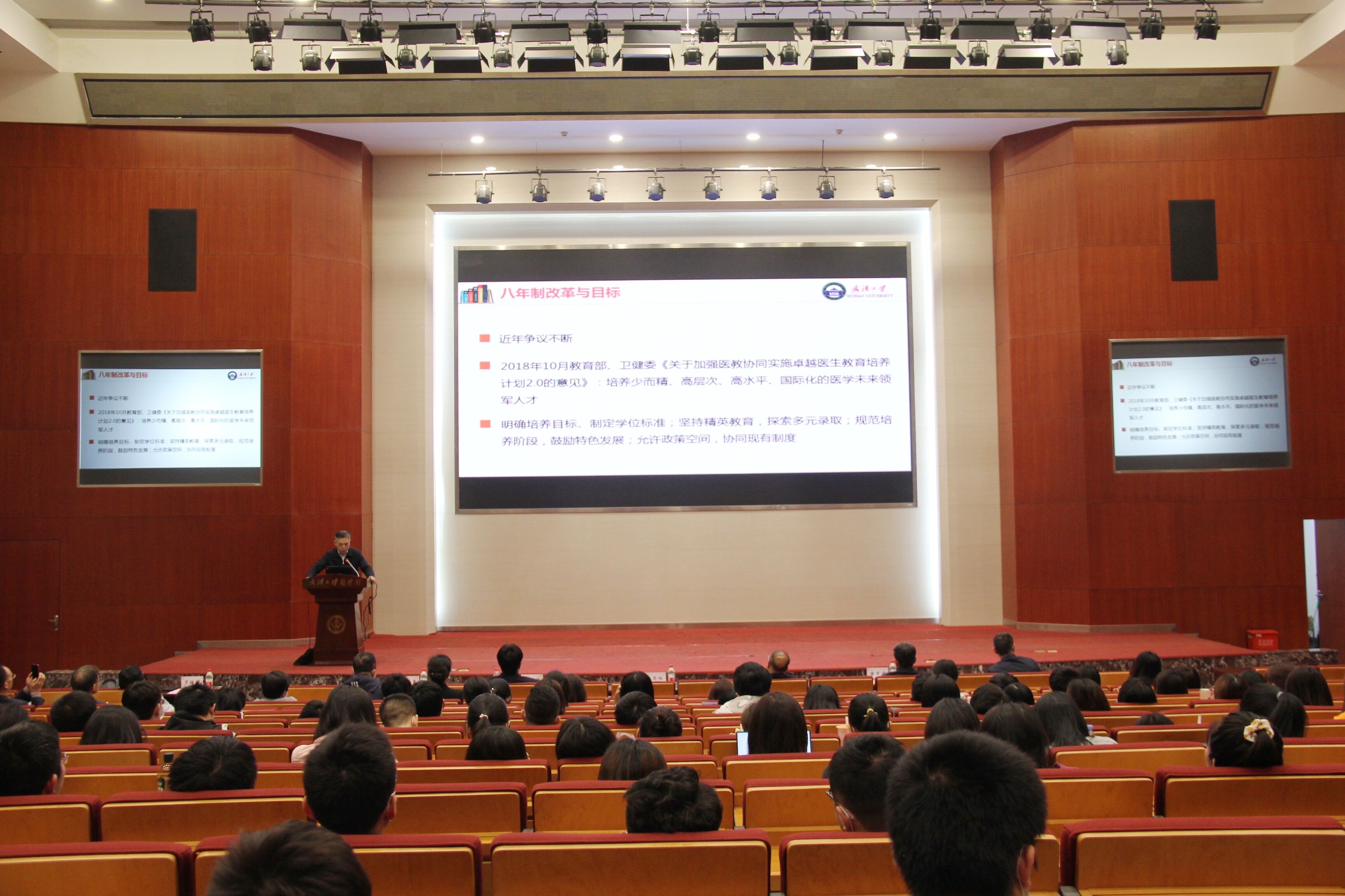 医学部常务副部长余祥庭,人民医院党委副书记余锂镭,中南医院副院长章军建,口腔医院副院长尚政军,各学院主管教学和学生工作负责人、人事处负责人、教办负责人、学工书记及八年制辅导员,2013、2014级8年制临床医学学生、口腔医学学生代表200余人聆听了报告。