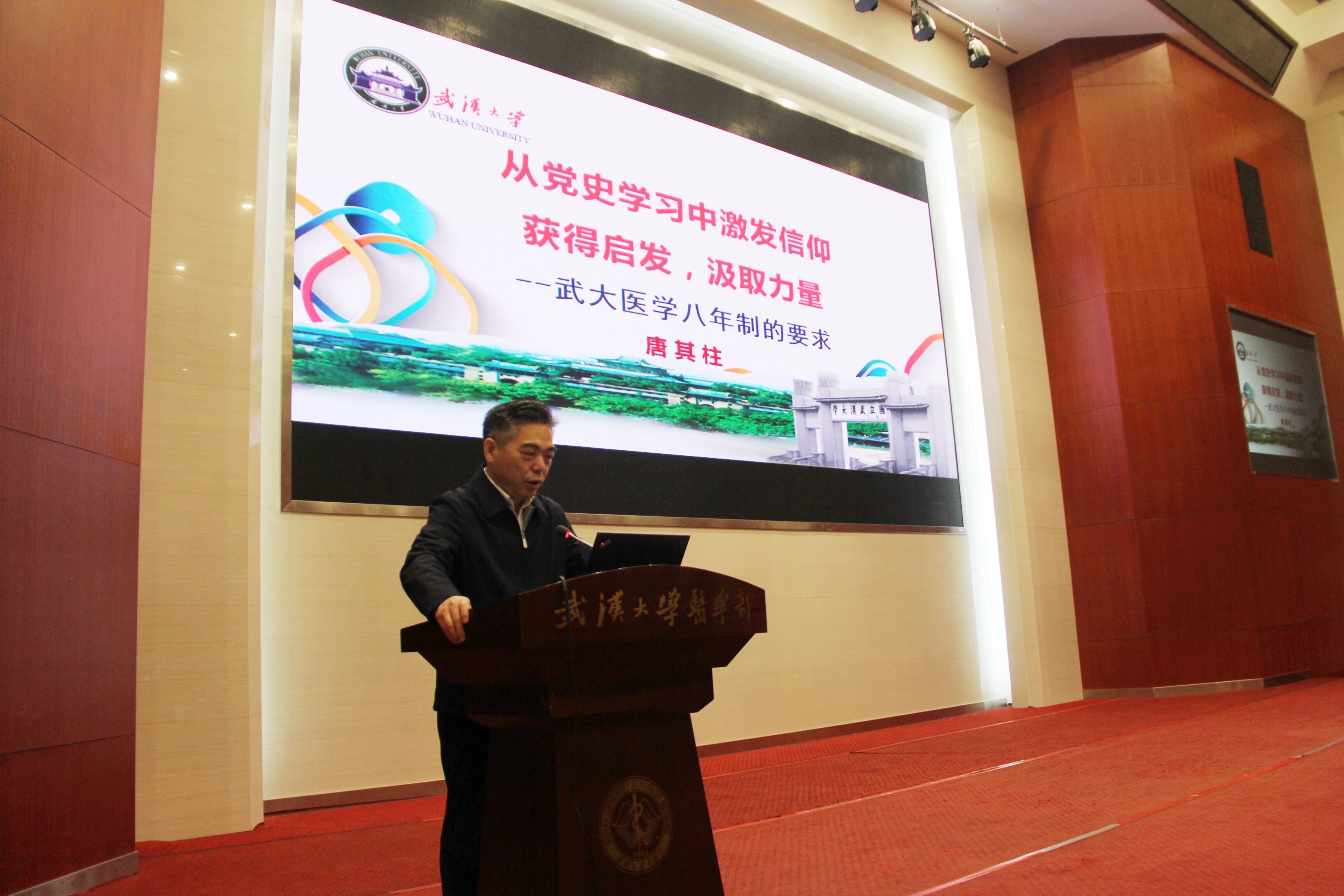 以《从党史学习中激发信仰,获得启发,汲取力量--武大医学八年制的要求》为题,结合党史、校史和我校医学教育发展史,唐其柱介绍了八年制医学教育现状、改革与目标,并由此引出武大医学八年制面对的机遇与挑战。他表示,我们应该以习近平新时代中国特色社会主义思想为指导,按照党中央、国务院决策部署,落实立德树人根本任务,注重能力培养,着力创新体制机制,推进学科交叉融合,加快高层次复合型医学人才培养。