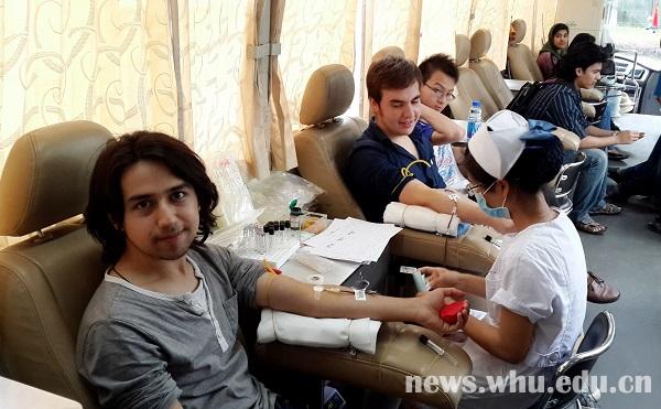 本网讯(通讯员蒋明)5月24日,武汉血液中心献血车开进梅高美集团4858首页地址,停靠在体育馆门前,中国、土耳其、孟加拉国、尼泊尔、印度等国家的90多名大学生上车献血。图为梅高美集团4858首页地址临床医学专业2013级土耳其留学生雅自制(...
